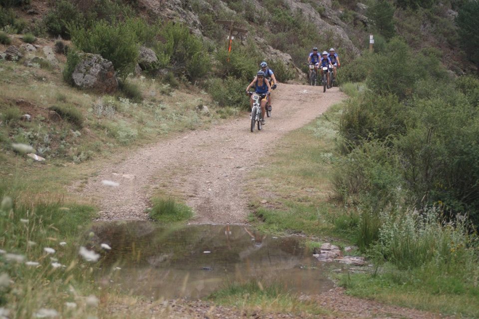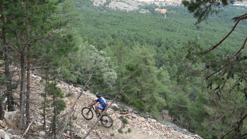 En la cima comenzaba una larguísima senda que tras una pequeña subida empalmaba con la senda del Camping y nos dejaba en Bronchales, fin del primer bucle o ruta corta. La senda resulta un poco complicada al principio debido a la piedra suelta y la elevada pendiente pero luego se convierte en una senda espectacular por el medio de la pinada. Bajamos poco a poco esperando a Noe que prácticamente quitando el primer tramo (igual que yo) la hace completa sobre la bici. En la subida hacia el Camping me adelanto un poco y hago la senda que nos lleva al pueblo rápidamente tras otros bikers.